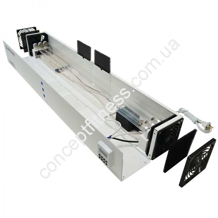 Рециркулятор-опромінювач з трьома лампами БактоСфера ОРББ 30х3 Макс Ефект, артикул 4820174320284 оснащується 6 фільтрами, таймером, індикатор справності, а також металевою конструкцією. Максимальна площа знезараження досягає 60 кв.м. Провід довгий, дозволить зафіксувати модель на дюбелях на стінці, стелі, встановити на тумбу, шафу або стіл. Приладом можна кварцевать приміщення можна, коли в ньому знаходяться люди, рослин і навіть тварини.