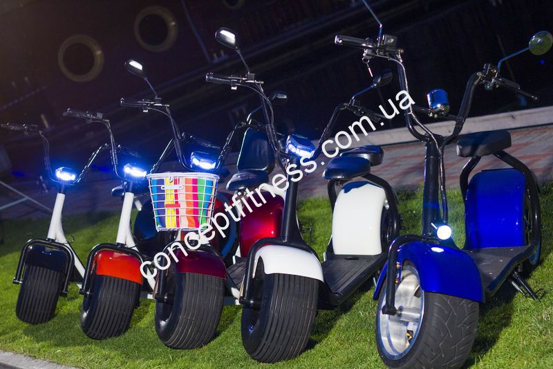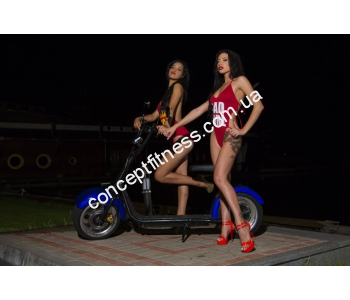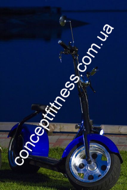 Чорно-синій міський скутер з електродвигуном Моісеєвим СітіКоко, артикул EB-0349 оснащується надувними широкими колесами, виділяється унікальним дизайном. Безпека гарантують дискові, 180 мм гідравлічні гальма. Алюмінієві диски, широкі покришки, потужний двигун, поряд з передніми амортизаторами і сидінням на двох дозволяє відчувати себе завжди в центрі уваги. Така модель дозволить заощадити на обслуговуванні і витратах на паливо, адже для неї потрібна тільки розетка, навігатор по маршруту. На електроскутері Seevможно проїхатися по міських вулицях, невеликому бездоріжжю, відчути шелест вітру на голові. Байк оснащується бортовим комп'ютером, обвісом фар, добре синхронізується з Андроїд, ІОС.